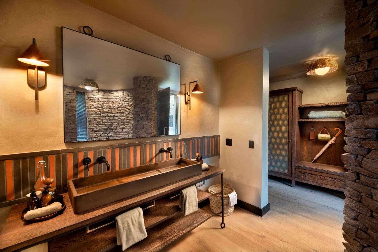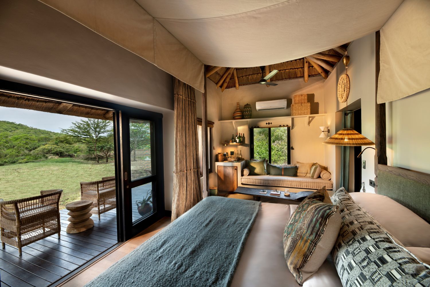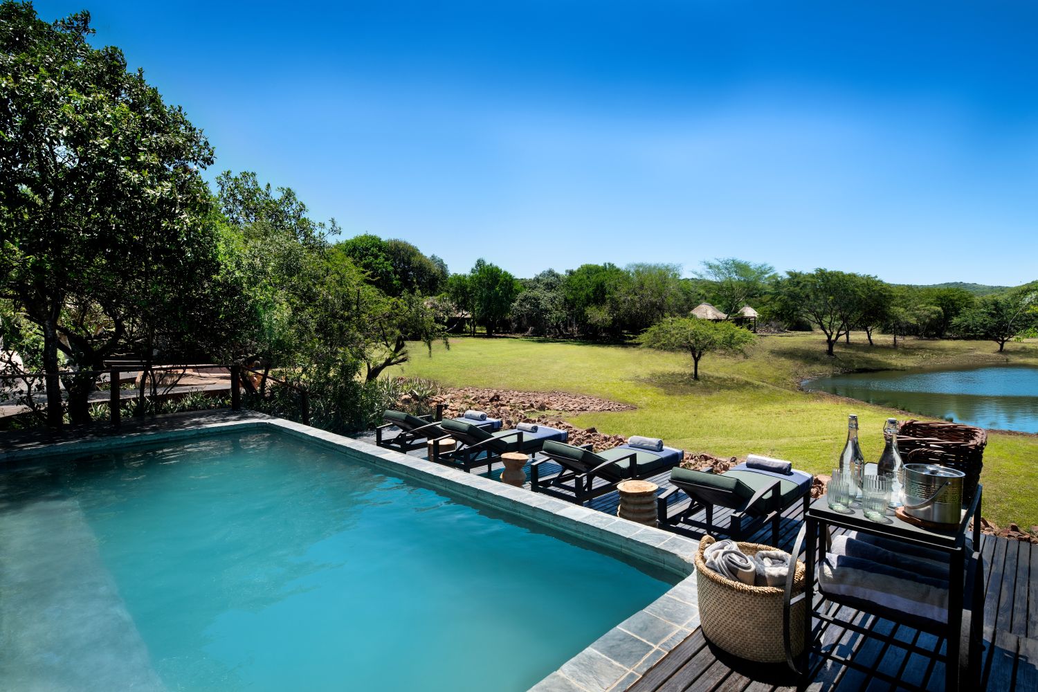 Die drei Suiten gruppieren sich um ein belebtes Wasserloch, an dem regelmäßig eine Vielzahl von Wildtieren zu sehen ist und die Vogelwelt floriert. Jede Suite verfügt über ein luxuriöses Badezimmer mit einer runden Badewanne, zwei Duschen (innen und außen) und zwei Handwaschbecken. Bequeme Loungesessel auf der privaten Veranda laden zum Verweilen oder sogar zu einer nachmittäglichen Siesta ein. Jede der drei Unterkünfte ist unter Stroh versteckt und verfügt jetzt über einen privaten, schattigen Außenbereich. Eine ruhige Ecke, perfekt zum Essen, Träumen oder einfach nur zwischen den Wildbeobachtungen.