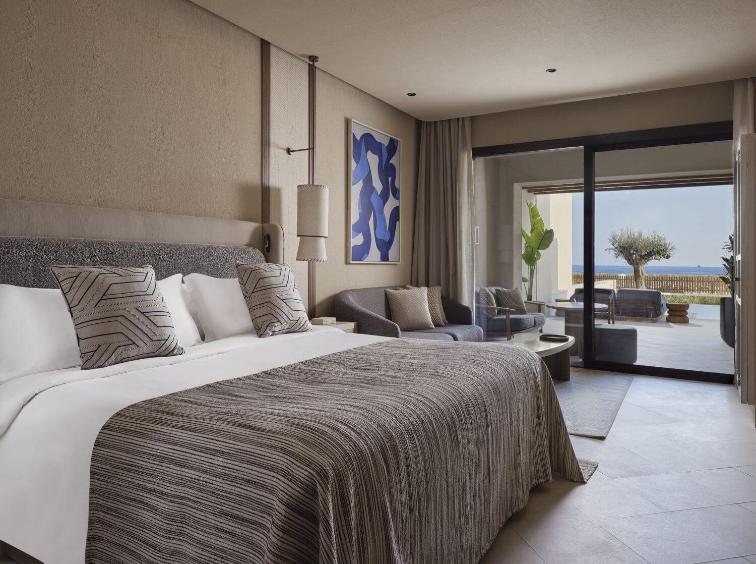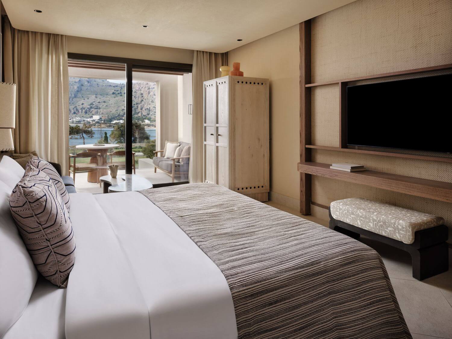 Die Hemera Hideaway Zimmer verfügen über ein Schlafzimmer mit Sitzgelegenheit. Vom Balkon genießen Sie einen Blick ins Landesinnere.