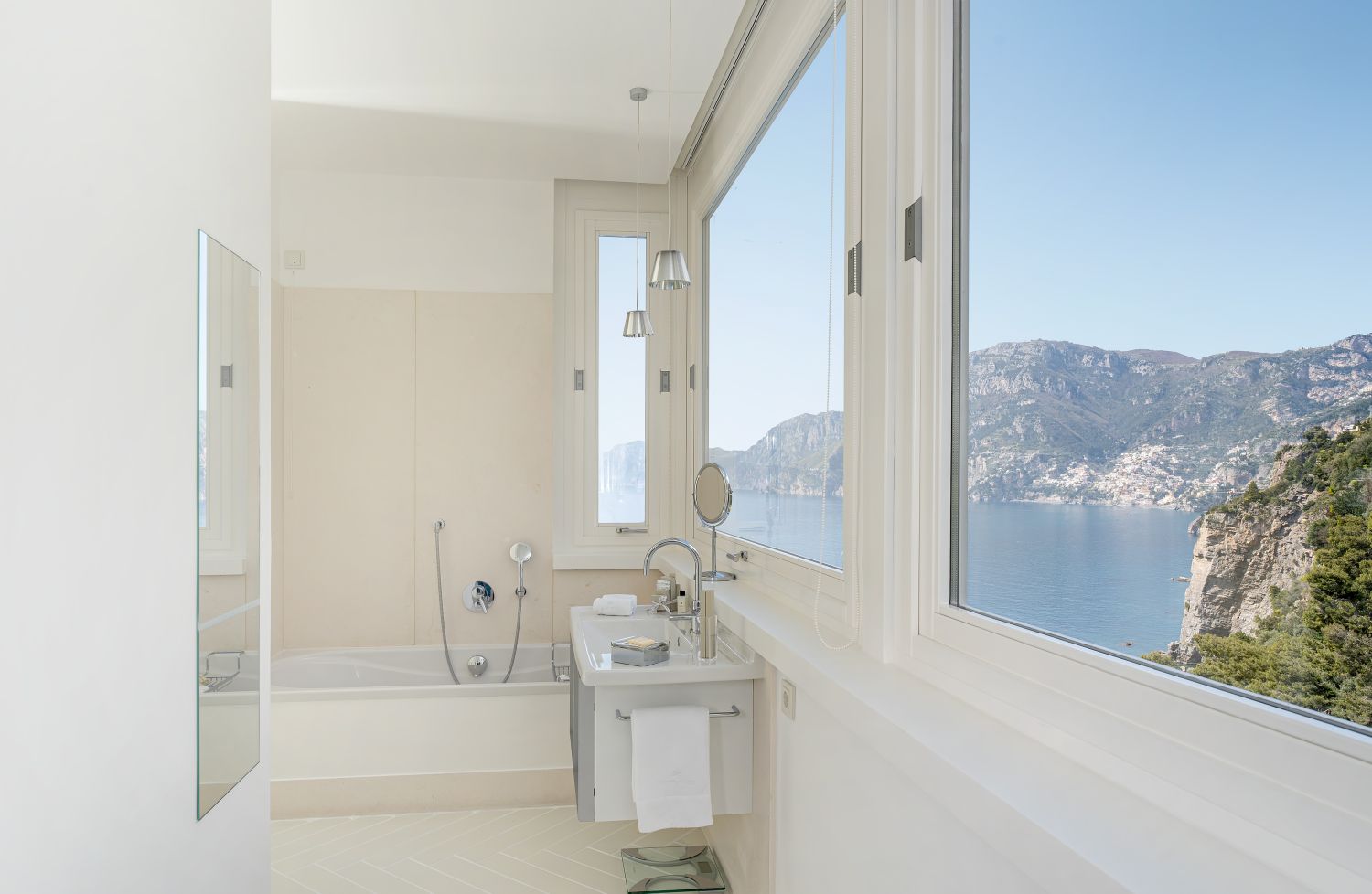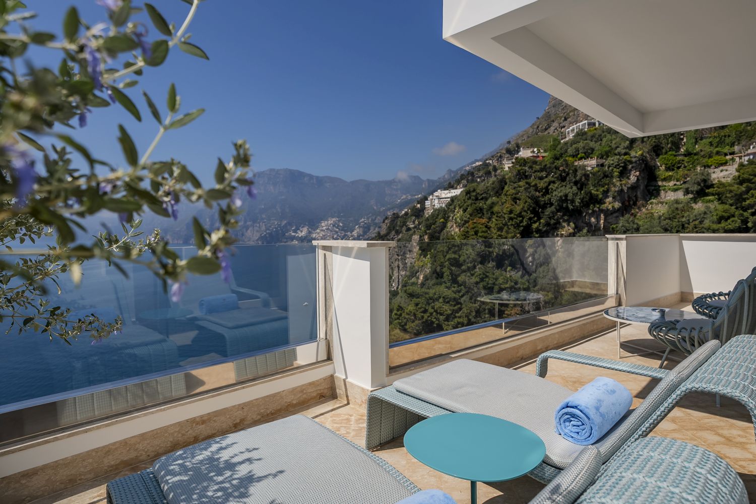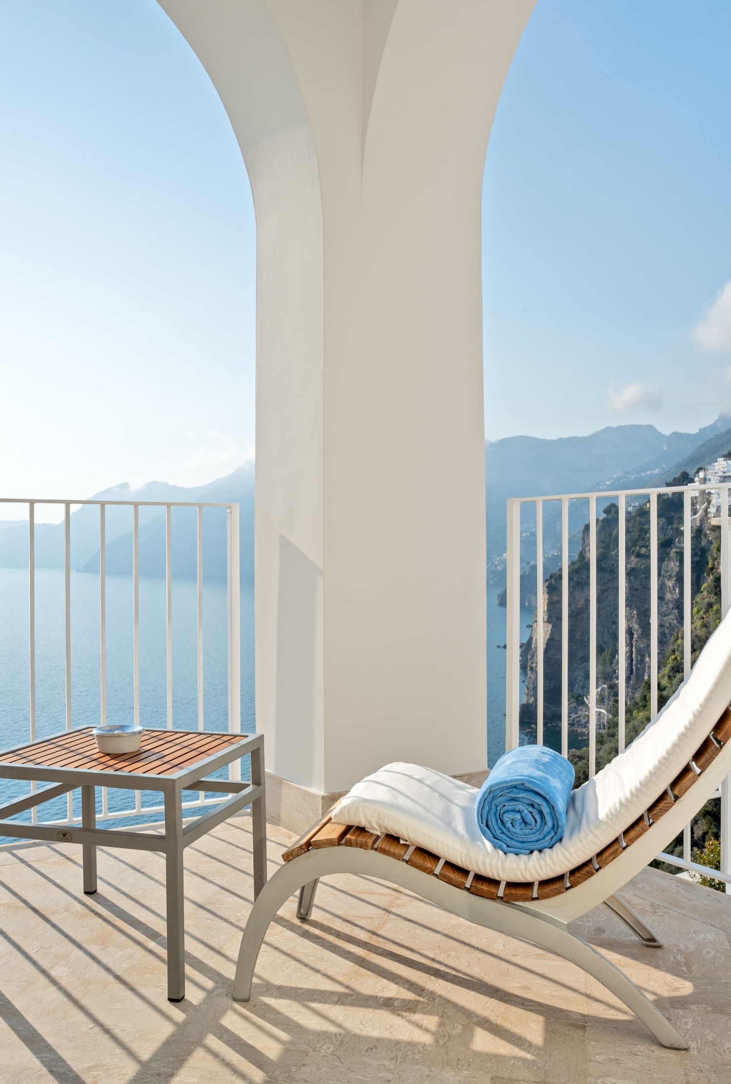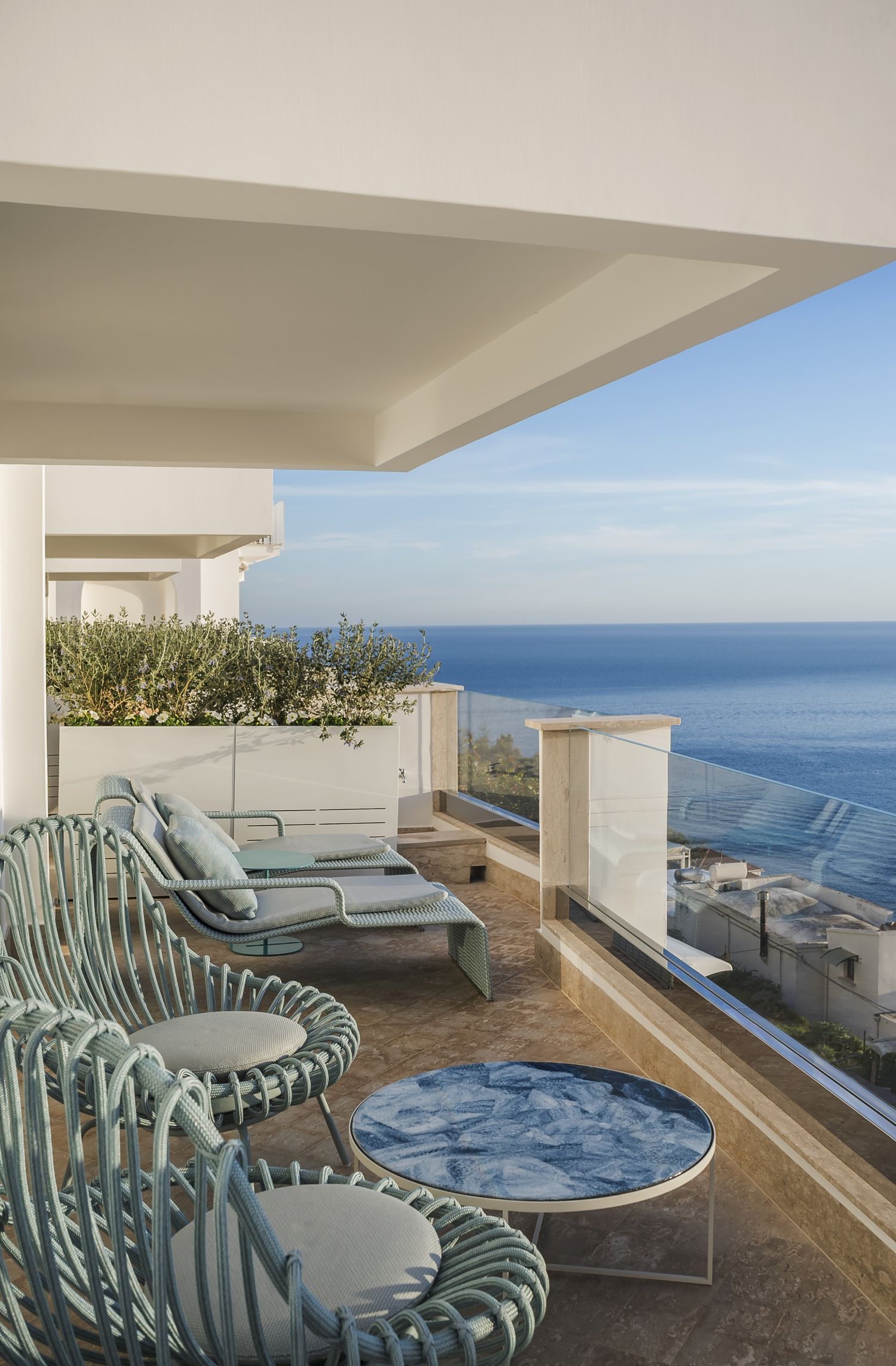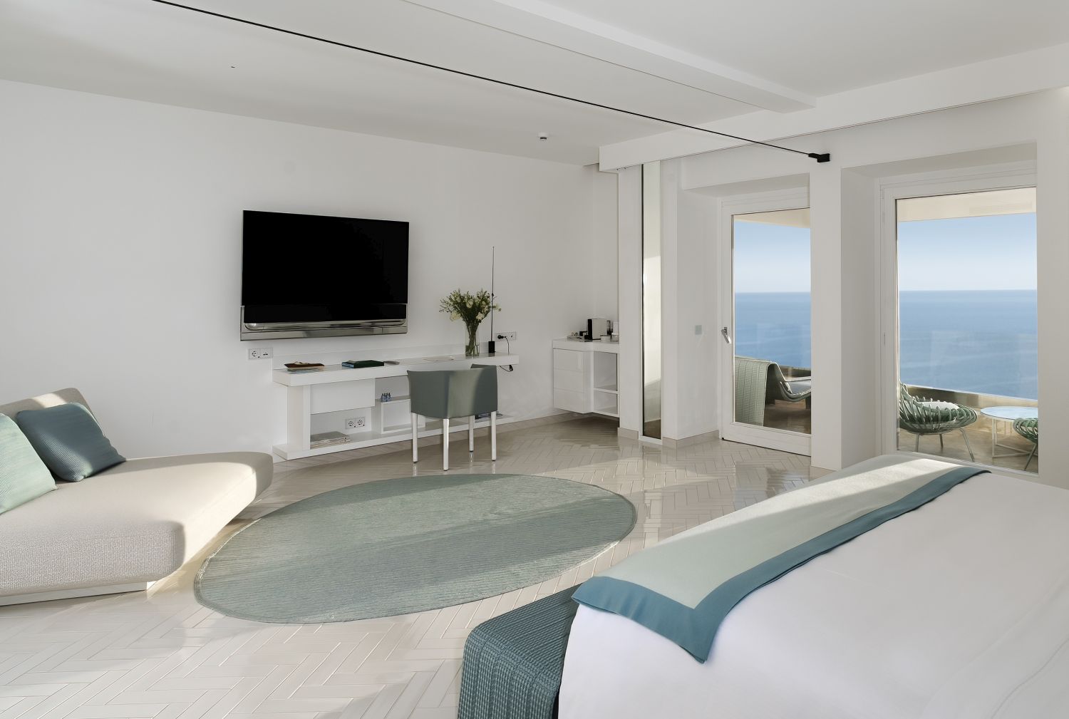 Die Azure Suite ist ein einzigartiges, immersives Designerlebnis, das von der renommierten Innenarchitektin Paola Lenti kuratiert wurde. Inspiriert von den atemberaubenden Ausblicken auf Meer und Himmel schuf Lenti eine moderne Oase für die anspruchsvollsten Gäste, die in beruhigenden Blau- und Weißtönen gehalten ist. Diese großzügig ausgestattete Suite zeugt von Lentis mutigem, künstlerischem Gespür und bietet 50 m² Wohnfläche, darunter ein komfortables Wohnzimmer, ein Schlafzimmer, ein geräumiges Badezimmer und einen begehbaren Kleiderschrank. Die Azure Suite besticht durch ihre weitläufige Terrasse mit Blick auf Positano und Capri.