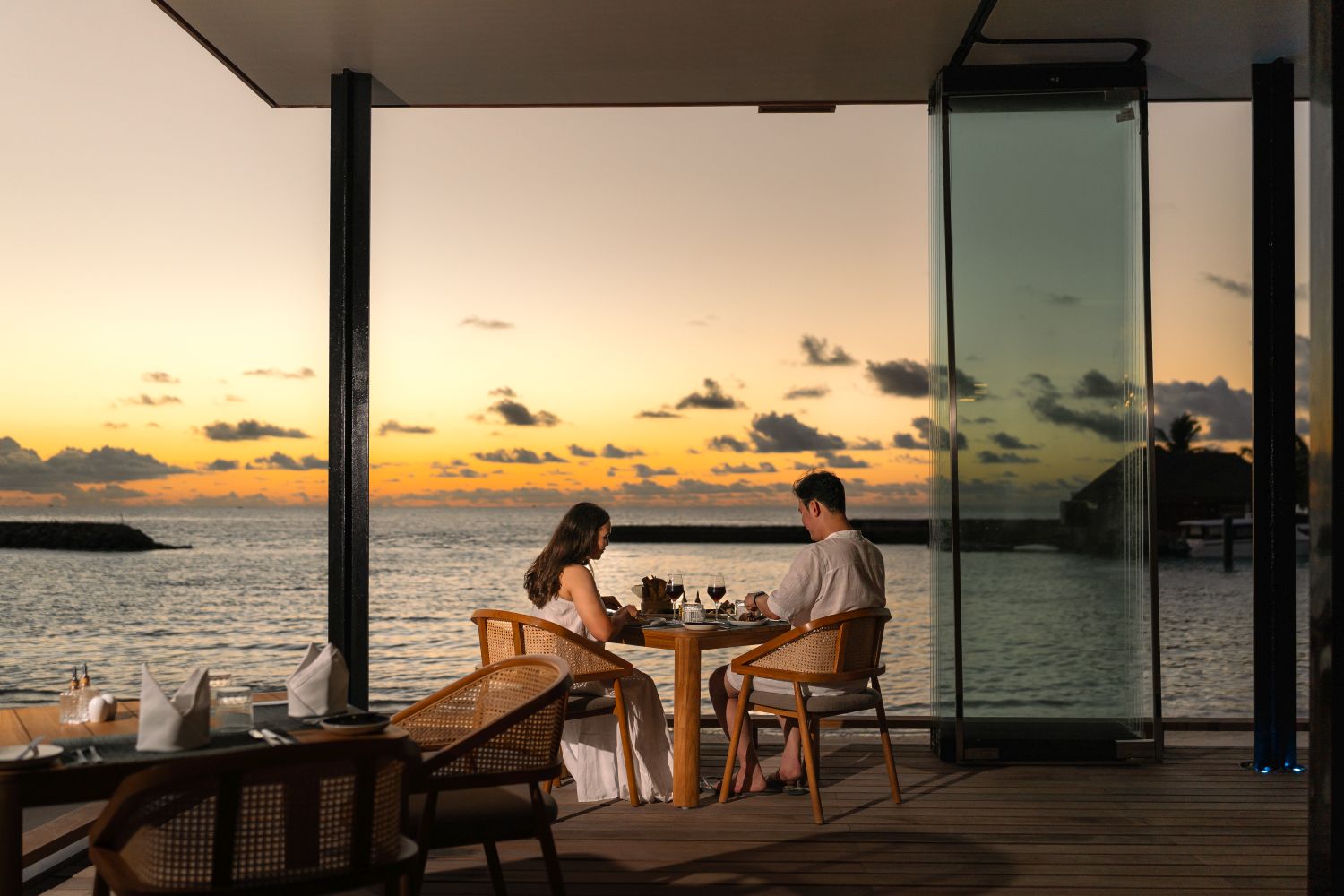 Die Sunset Ocean Villa verfügt über ein Schlafzimmer und einen offen gestalteten Innenbereich mit integriertem Wohnzimmer. Sie liegt auf Stelzen über der Lagune auf der Westseite der Insel und bietet einen ungestörten Blick auf den Sonnenuntergang. Der Außenbereich besteht aus einem großzügigen Deck mit direktem Zugang zur Lagune sowie entspannten Sitz- und Liegeflächen.