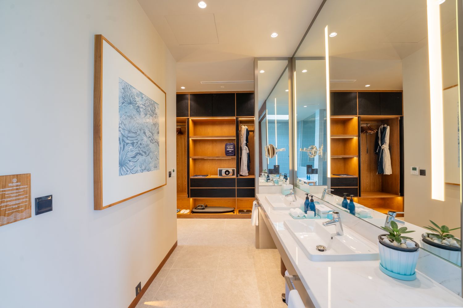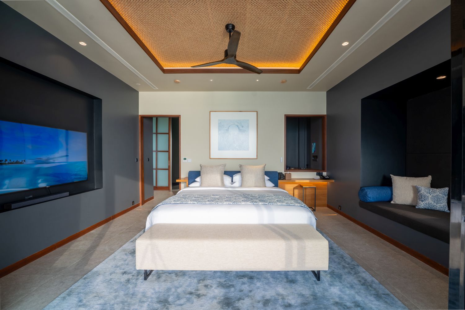 Die größte Kategorie bietet zwei Schlafzimmer und einen separaten Wohnraum. Sie liegt über Wasser auf der Sonnenuntergangsseite und kombiniert maximale Privatsphäre mit Weitblick. Der Außenbereich beeindruckt mit großzügigen Terrassenflächen, zwei privaten Pools und direktem Zugang zum Meer.