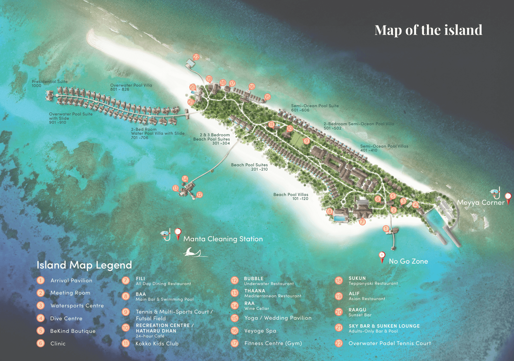Die Over Water Presidential Suite with Slide ist die exklusivste Option im Resort: vier Schlafzimmer, weitläufige Wohnbereiche und ein großer Pool schaffen Raum für ungestörten Luxus. Die Rutsche ins Meer und die spektakuläre 360°-Lage machen sie zum ultimativen Highlight.
