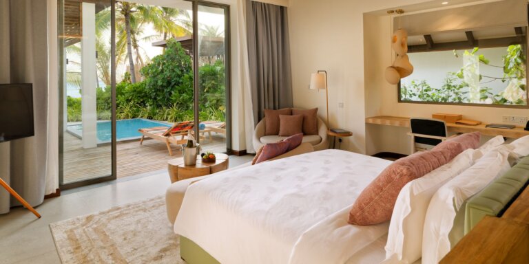 Die Beach Pool Villa verfügt über ein Schlafzimmer mit offenem Raumgefühl und großen Glasfronten. Auf der Terrasse mit privatem Plunge-Pool genießen Sie den Blick auf Strand und Meer.