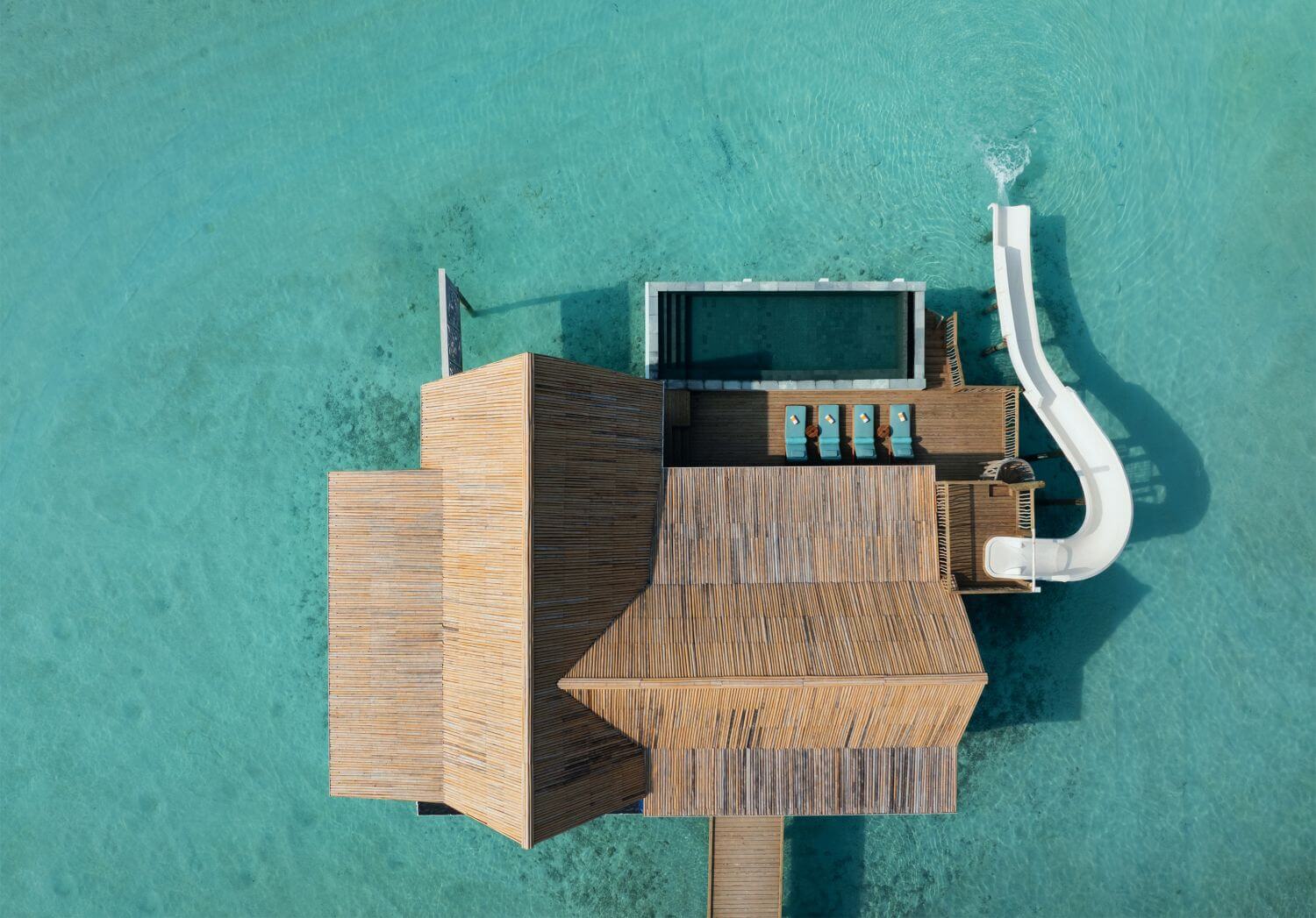 Die Water Pool Villa with Slide ist über der Lagune gebaut und verfügt über einen privaten Pool, direkten Zugang zum Meer und eine Wasserrutsche für zusätzlichen Spaß.