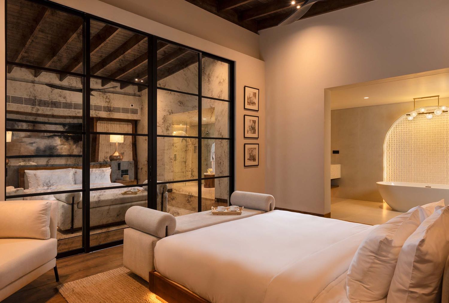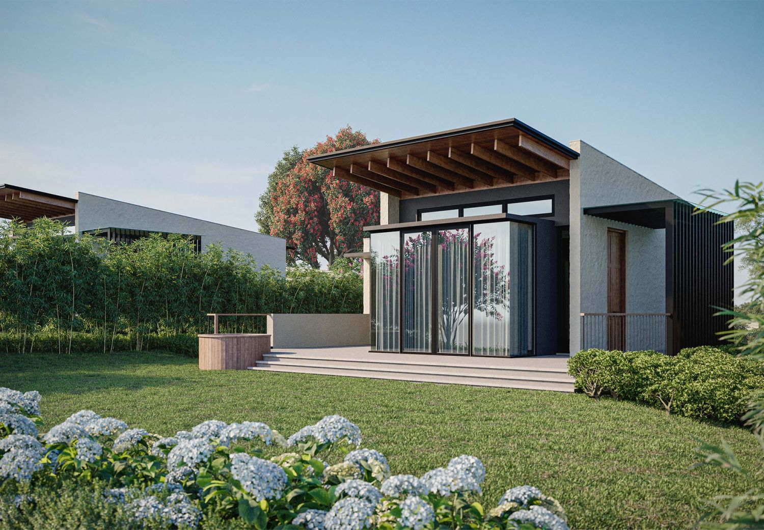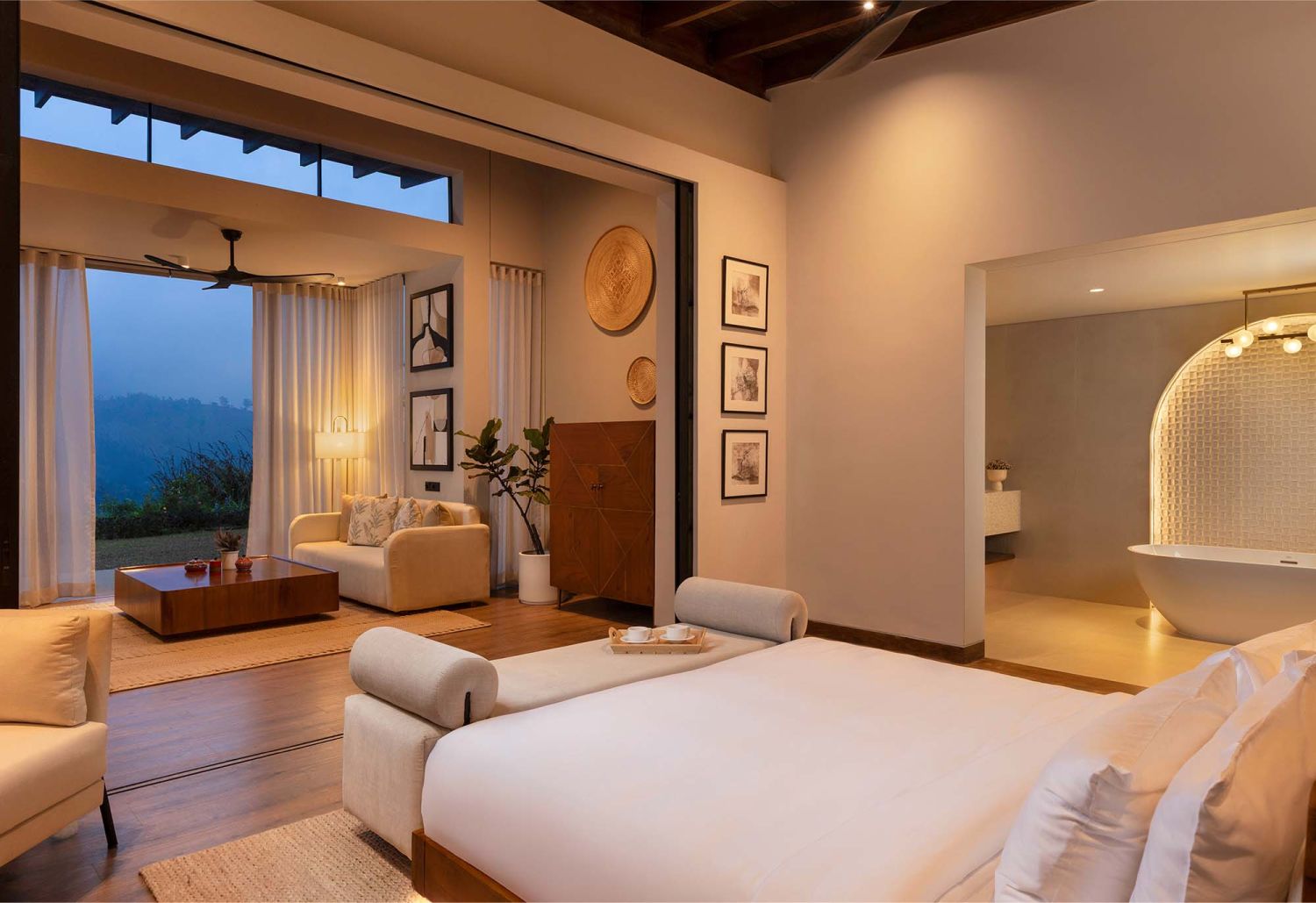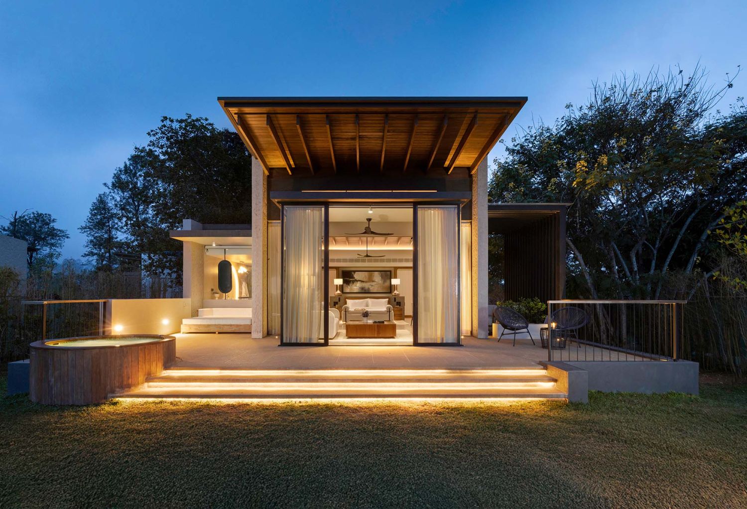 Die freistehenden Villen im bieten großzügige Wohnflächen mit einem Schlaf- und Wohnbereich, welcher sich durch eine Schiebtür separieren lässt. Zudem verfügen die Villen über einen privaten Jacuzzi sowie über eine weitläufige Terrasse. Viel Glas und natürliche Materialien schaffen eine ruhige Atmosphäre mit Bezug zur umliegenden Landschaft.