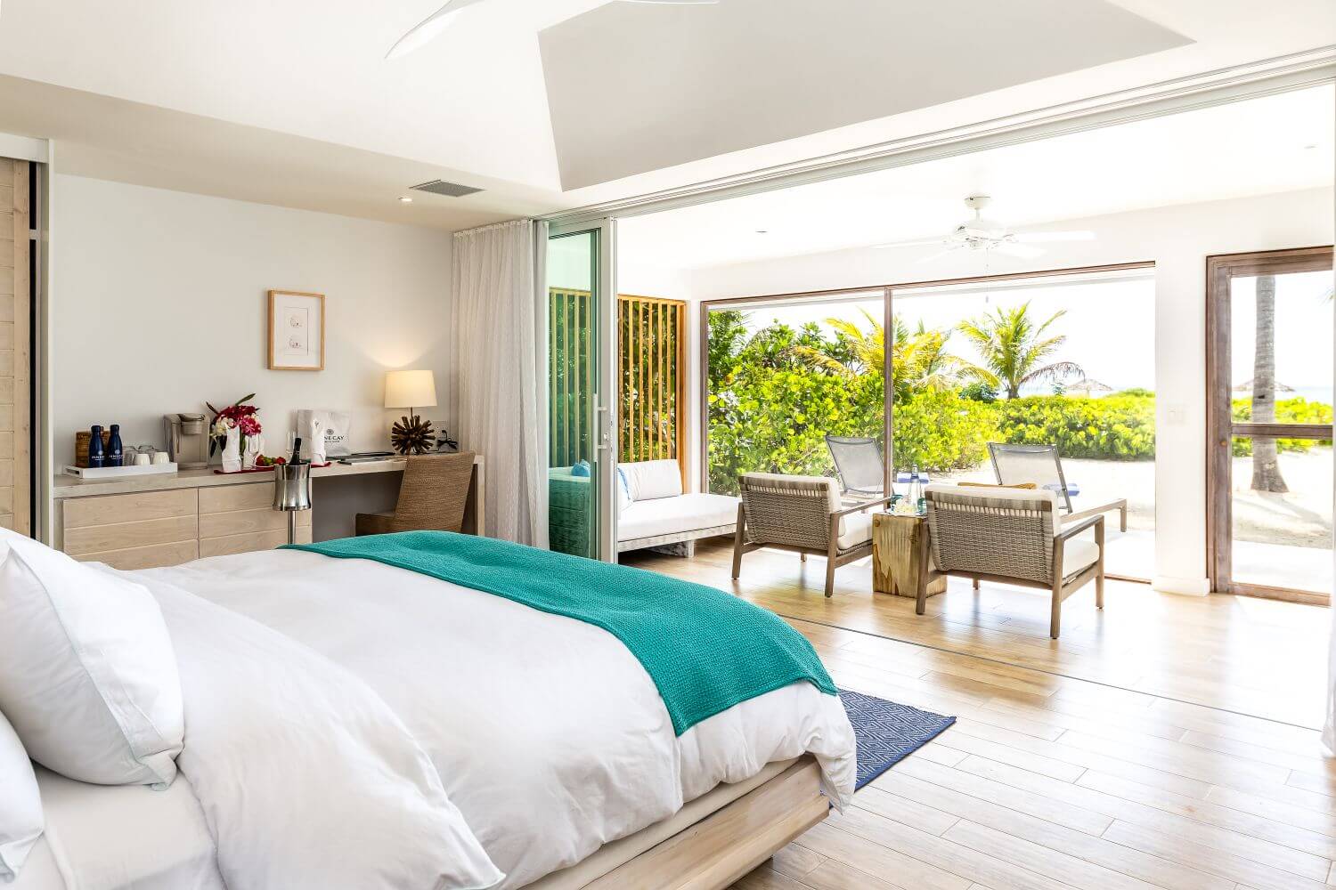 Die Ocean Front Suites verfügen über einen kombinierten Wohn- und Schlafraum. Sie liegen direkt am Strand und bieten neben einem schönen Außenbereich, einen traumhaften Ausblick.