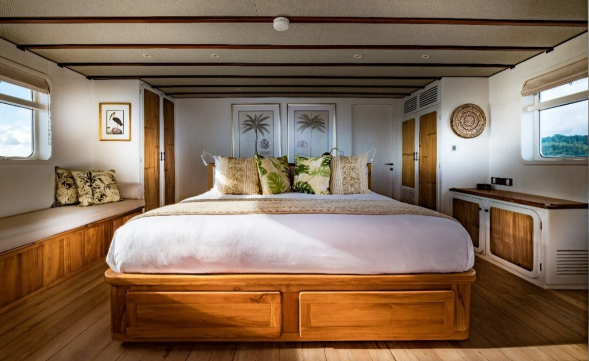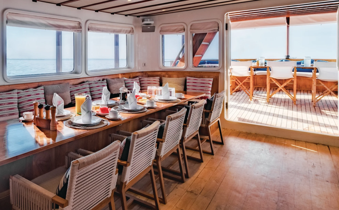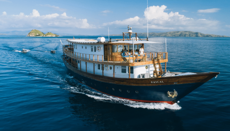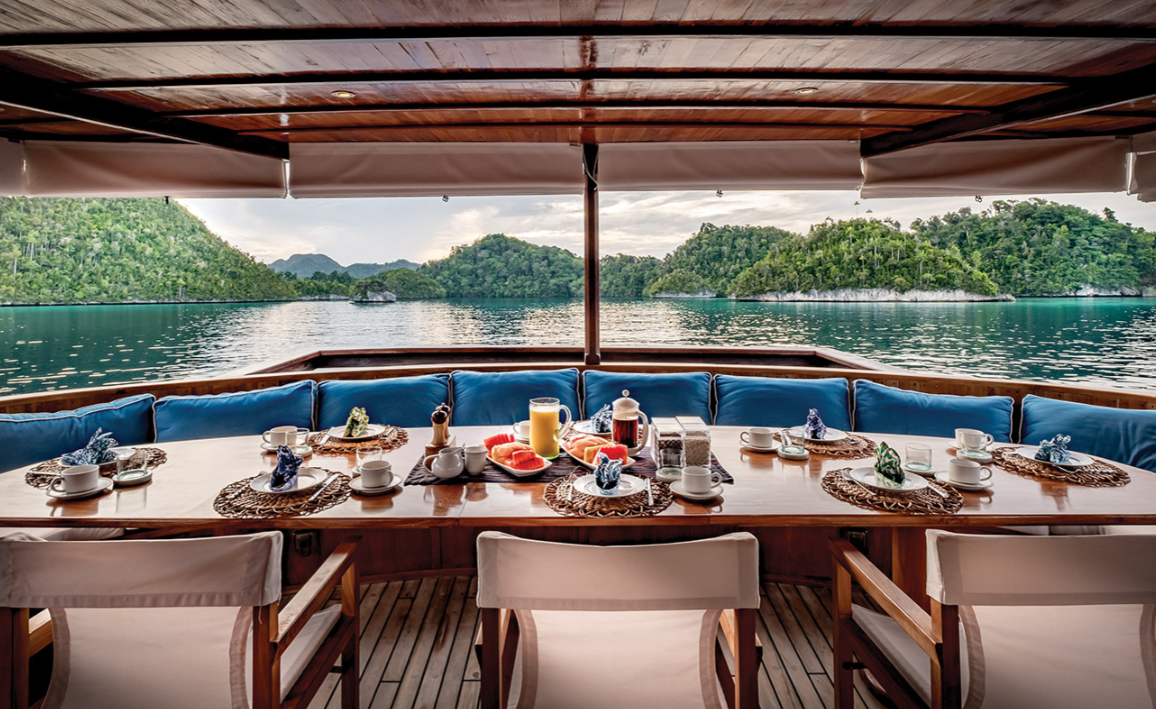 Das Design der Rascal ist eine Hommage an tropischen Minimalismus: helle Hölzer, maritime Akzente, natürliche Stoffe. Auf dem Sonnendeck wird gegessen, geträumt, gelesen – oder einfach geschwiegen, während das Meer unendlich scheint. Die Küche serviert leichte, frische Gerichte mit asiatischen und westlichen Einflüssen, begleitet von ausgesuchten Weinen und Cocktails bei Sonnenuntergang. Wenn die Nacht hereinbricht, leuchtet der Himmel über Raja Ampat in Millionen Sternen. Man sitzt an Deck, barfuß, mit einer Brise im Haar und begreift, warum dieser Ort als einer der schönsten der Welt gilt.