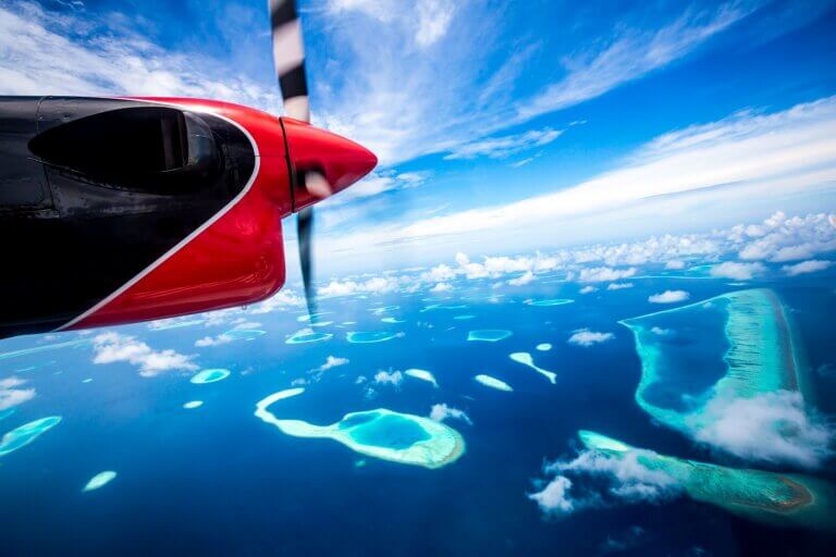 Die Malediven bestehen aus einer Kette ringförmiger Atolle, die aus Korallenriffen mit geschützten Innenlagunen gebildet werden. Zwischen den einzelnen Inseln liegen meist nur kurze Distanzen, die sich bequem per Boot überbrücken lassen. Längere Strecken, etwa zwischen den Atollen, werden mit dem Wasserflugzeug oder Inlandsflug zurückgelegt – ein Erlebnis für sich, das zugleich spektakuläre Ausblicke bietet.